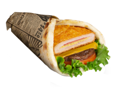 2 steaks, 2 tranches de cheddar, cordon bleu, salade, tomate oignon et 2 délicieuses sauces